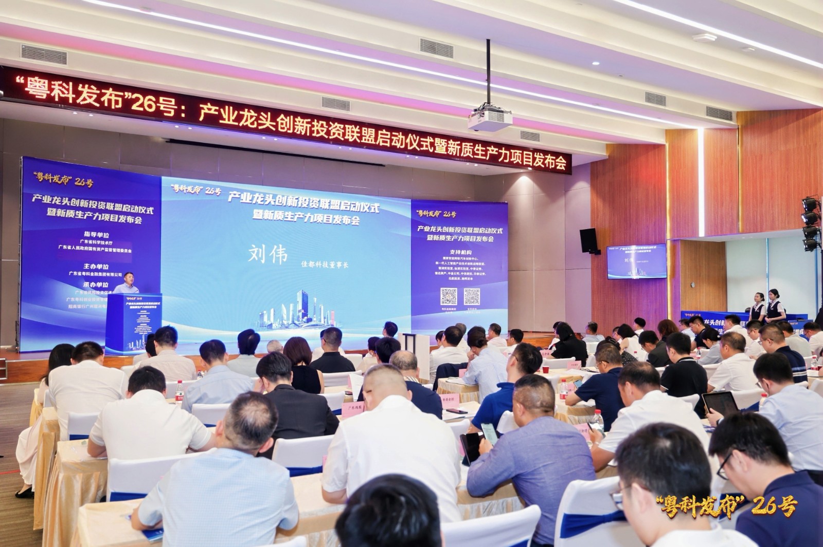 8月9日,“粤科发布”26号——产业龙头创新投资联盟启动仪式暨新质生产力项目发布会在广州举行,汇集首批产业链龙头企业及高校院所30多家,签约基金总规模135亿元,优质项目100个,有效促进产业科技投融资对接,助力产业延链补链强链。leyu.com科技集团董事长兼CEO刘伟出席联盟启动仪式,就成立产业龙头创新投资联盟发表倡议讲话。